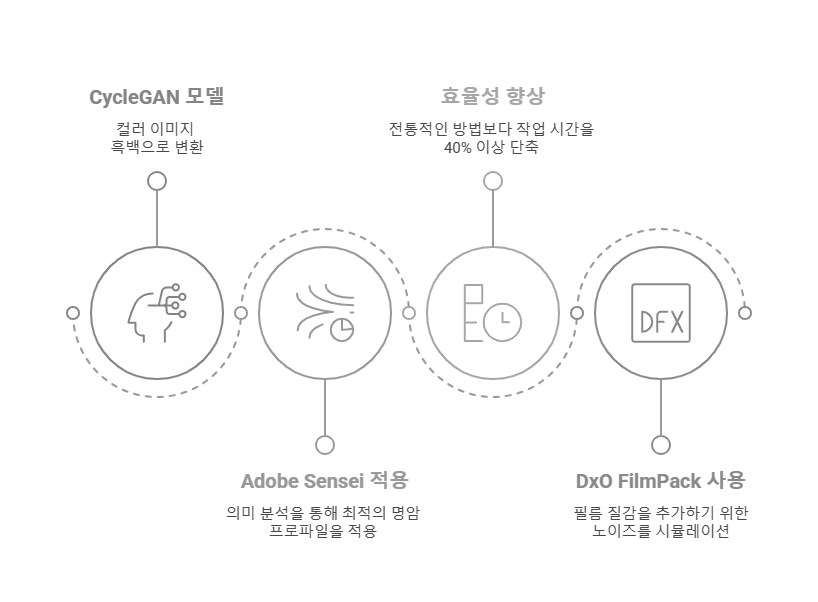 최신 신경망 모델(CycleGAN 등)은 컬러-흑백 이미지 쌍 학습을 통해 상황별 최적화된 변환을 수행합니다. Adobe Sensei는 이미지 분석 후 피사체별로 최적 명암 프로파일을 적용해 편집 시간을 단축시킵니다.