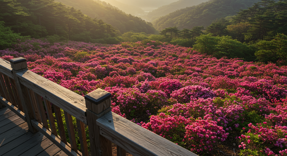 해발 800m 이상 고지대에 드넓게 펼쳐진 철쭉 평원은 마치 분홍색 카펫을 깔아놓은 듯한 비현실적인 풍경을 선사합니다. 특히 5월 초중순 절정 시기에는 산 전체가 활활 타오르는 듯한 착각마저 불러일으키죠. 이 아름다운 풍경 속에서 인생샷을 남길 수 있는 포토 스팟 몇 군데를 추천해 드릴게요.