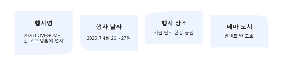 단순히 책 제목만 빌려온 것이 아니라, 무대 연출이나 현장 이벤트, 부스 등에서 반 고흐의 작품 세계와 편지의 감성을 느낄 수 있도록 준비될 예정이라고 합니다. 명화 감상을 좋아하는 분들이라면 음악과 함께 더욱 풍성한 예술 축제를 경험할 수 있는 절호의 기회! 과연 lovesome 페스티벌이 반 고흐의 어떤 이야기를 음악으로 풀어낼지, 현장에서 직접 확인해 보세요.